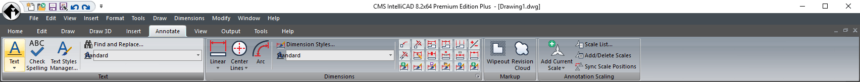 The CMS IntelliCAD® ribbon contains several areas from which to choose commands: Ribbon Application button, Quick Access toolbar and Tabs. Note that some few features are ONLY available at the PE Plus edition.