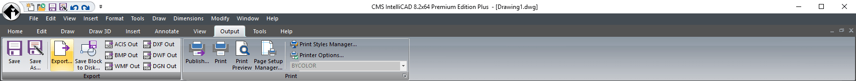 File Export and Plot features are available at the OUTPUT tab. Exporting drawing fle or entities to *.DXF, DWF, SAT, BMP, WMF, EMF, PDF, SVG, STL and DAE file formats. PLOT through PUBLISH or PRINT, and set or manage print style are features available at this tab.