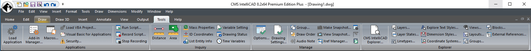 TOOLS tab gives access or runs custom applications development such as Microsoft VBA or .NET, LISP, IRX, SDS. Tools tab also is able to inquiry drawing entities like AREAS, MASS PROPERTIES, etc. or define variable settings. Manage drawing settings, external references and customize user menus, toolbars, keyboard shortcuts and alias. Major EXPLORE features are also available at the TOOLS tab.